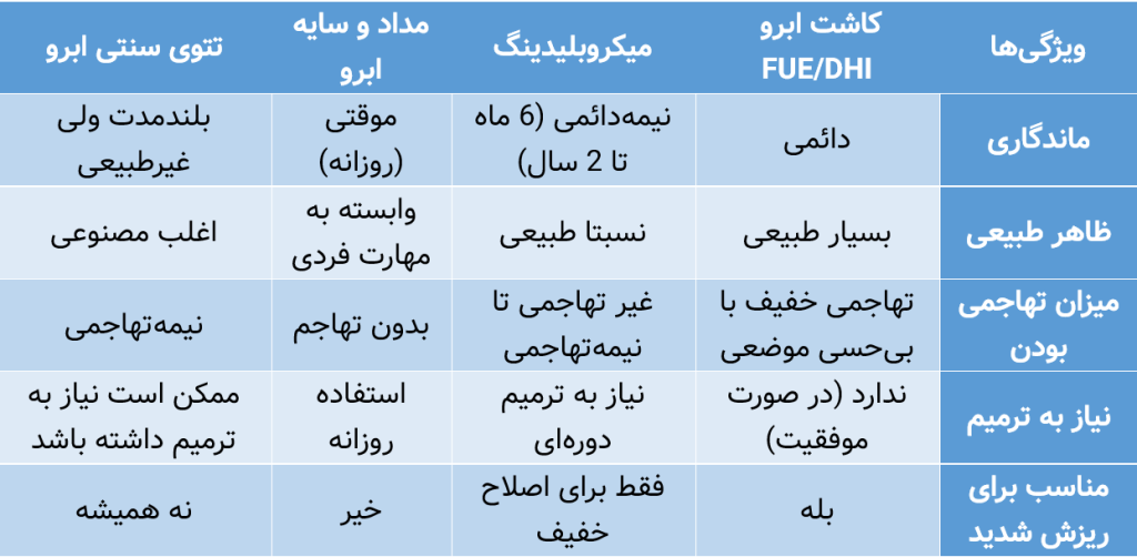 انتخاب بهترین راهکار برای جبران ریزش ابروها، به عوامل مختلفی بستگی دارد؛ اما بدون شک، تفاوت قابل توجهی میان روشهای دائمی مانند کاشت ابرو و روشهای موقتی یا آرایشی وجود دارد. جدول زیر مقایسهای ساده و کاربردی میان این روشها ارائه میدهد.